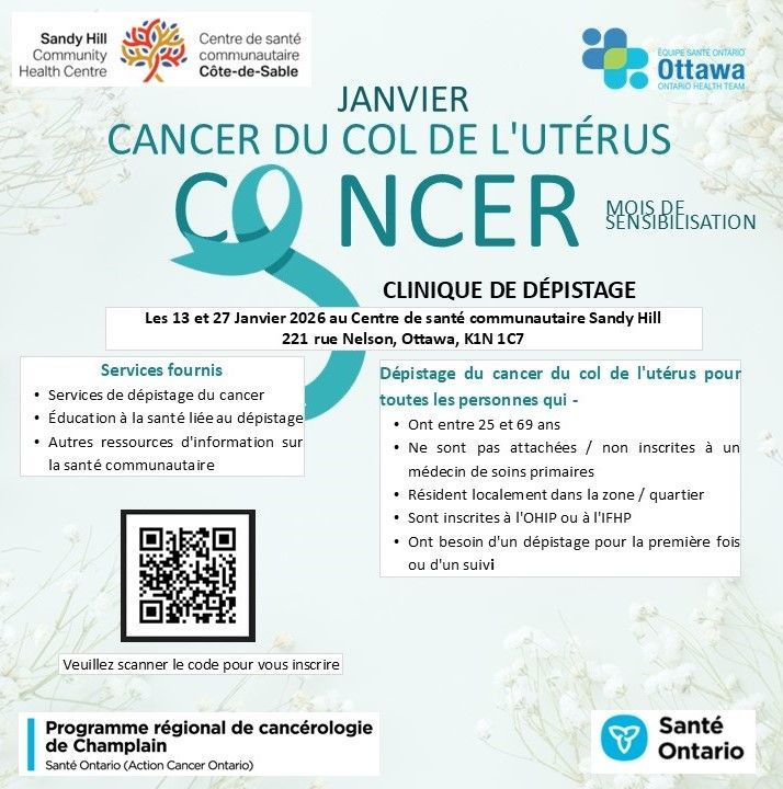 Poster for a cervical cancer screening clinic in Ottawa. January is Cervical Cancer Awareness Month.